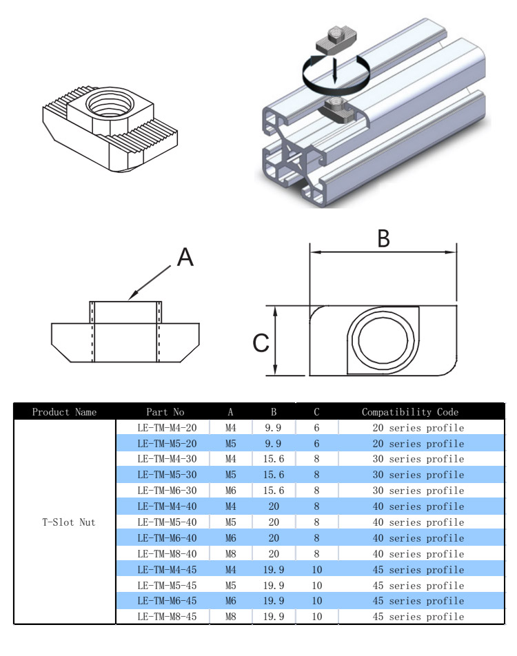 Uso:T-slot nut is simple to use and convenient to connect aluminum profiles to other parts.